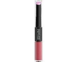 De Infaillible 24H lipstick 213 Toujours Teaberry\nBenadruk de lippen met de Infaillible 24H lipstick 213 Toujours Teaberry voor een intense kleur die de gehele dag én nacht blijft zitten. Ontdek de voordelen:\n- Stap 1: tot 24 uur intense kleur door de sterk gepigmenteerde kleurformule\n- Stap 2: tot 24 uur verzorging met de hydraterende balsem die verrijkt is met hyalurongel\n- De roze L’Oréal lipstick is tot 24 uur life proof, de lipstick vervaagt namelijk niet gedurende de dag\n- Nu vernieuwd met de toevoeging van de color boosting technologie in de verzorgende balsem\n- L’Oréal Infaillible Lipstick is nu verkrijgbaar in 15 prachtige, intense kleuren\n\n Productbeschrijving\n In twee simpele stappen zijn de lippen verzekerd van een intense kleur met een comfortabel gevoel gedurende de dag. De langhoudende lippenstift blijft namelijk tot 24 uur lang zitten een geeft niet af. De Infaillible 24H lipstick, eerst bekend als Infallible 24H lipstick, bevat intense kleurpigmenten. Deze kleurpigmenten zorgen ervoor dat de lippen tot 24 uur intens gekleurd zijn.\n\nDe L’Oréal lipstick krijg een glanzende finish door het aanbrengen van de verzorgende balsem. De verzorgende balsem van de langhoudende 2-step lipstick is vernieuwd. Het is nu een color booster balsem waardoor de lipkleur nu wordt verrijkt met een prachtige glans. De balsems zijn namelijk nu afgestemd de kleurfamilie waar de lipstick bij hoort (nude, roze, rood of paars) zodat de kleur nog intenser lijkt. Hierdoor hebben de balsems ook een kleur waar ze eerder transparant waren. De met hyalurongel verrijkte lippenbalsem hydrateert de lippen waardoor ze minder droog aanvoelen dan bij een langhoudende lippenstift zonder verzorgende balsem. Zo geeft de balsem zowel extra kleurintensiteit als verzorging van de lippen.\n\nHet resultaat van de Infaillible 24H Lipstick 213 Toujours Teaberry \nInfaillible 24H lipstick 213 Toujours Teaberry heeft een roze kleur. De roze lippenstift kleurt de lippen intens en geeft een klassieke, elegante look. De lipkleur droogt mat op en krijgt een intense glans zodra de verzorgende balsem eroverheen wordt aangebracht. Doordat de lipstick verkrijgbaar is in 15 kleuren past er een langhoudende lipstick bij elke outfit. Ga bijvoorbeeld voor een subtiele nude kleur gedurende de dag en creëer een opvallende look met een roze lip tijdens een avondje uit. Your lips but bolder.\n\nHoe gebruik je de Infaillible 24H Lipstick\nStap 1: Kleur de lippen met een intense roze kleur die niet aflaat. Laat de langhoudende lippenstift drogen voor stap 2.\nStap 2: Verzorg de lippen met de nieuwe color booster verzorgende balsem die verrijk is met hyalurongel. Zo zijn de lippen tot 24 uur lang gehydrateerd en ontstaat er een prachtige glans op de lippen.