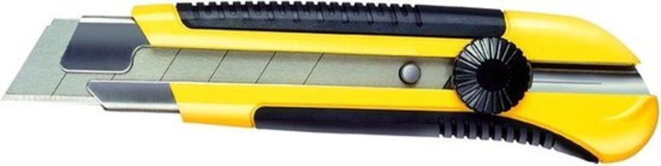- Roestvrij schuifmes gemakkelijk gebruik lange levensduur\n- Blokkeerschroef voor veiligheid en nauwkeurigheid\n- Comfortabele bimateriale handgreep van zacht elastomeer\n- Mes: 25mm breed en 0.7mm dikvoor zwaar werk\n- Ieder breekmesje heeft 6 messegmentjes\n- Geleverd met 1 afbreekmesje\n- Lengte 180mm