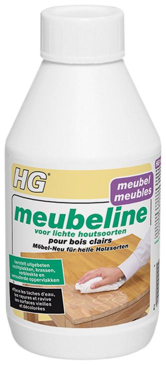 HG meubeline voor lichte houtsoorten is een hoogwaardig onderhoudsmiddel voor gebeitste, geoliede, onbehandelde of in de was gezette meubels van ongelakte lichtere houtsoorten zoals bijvoorbeeld grenen. In het hout uitgebeten water-, alcoholkringen en vlekken verdwijnen. Grauwe en verbleekte of verschoten oppervlakken krijgen hun natuurlijke kleur terug. Krassen worden door HG meubeline voor lichte houtsoorten gecamoufleerd.