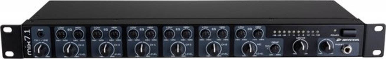 De JB systems MIX 7.1 betreft een 7-kanaals mixer/voorversterker voor microfoon- en lijnsignalen. De MIX 7.1 is van gebalanceerde jack-ingangen voor microfoonsignalen en ongebalanceerde RCA-ingangen voor lijnsignalen voorzien. Ook is er een Euroblock-input voor noodberichten aanwezig die automatisch alle andere audio mute zodra hier een signaal doorkomt; ideaal dus voor alarmsystemen. Eén van de microfooninputs is uitgevoerd met Talkover-functionaliteit waarvan je de damping en treshold kan instellen. Zo kan je achtergrondgeluid naar wens dempen wanneer de microfooninput in gebruik is. Ten slotte is ieder kanaal uitgevoerd met een 2-bands EQ waarmee je de hoge tonen en lage tonen naar wens kan instellen.
