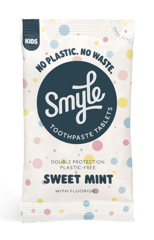 Smyle Tandpasta Tabs Sweet Mint Kids Navulling is een navul verpakking van de tandpasta tablet. Met een fluoridegehalte van 1000 parts per million biedt deze tandpasta optimale bescherming tegen tandplak en gaatjes. Smyle Tandpasta Tabs Sweet Mint Kids is dé ideale keuze voor ouders die streven naar gezonde tandverzorging voor hun kinderen. De lichtzoete mintsmaak maakt ze speciaal geschikt voor kinderen tussen 4 en 12 jaar oud.Deze navul verpakking bevat 65 tabletten en is volledig vrij van plastic.Smyle Tandpasta Tabs Sweet Mint Kids Navulling:Beschermt optimaal tegen gaatjes en versterkt het glazuurSpeciaal ontwikkeld voor kinderen van 4 tot 12 jaarBevat fluoride (1000 parts per million)Verfrissende en voedzame tandpastaVerpakking bevat 65 tabsMilieuvriendelijk, plasticvrijHoe te gebruiken?1. Neem een tablet2. Kauw fijn totdat het een schuimachtige substantie wordt3. Doe een beetje water bij de substantie4. Poets zoals u normaal zou doen5. Smyle!