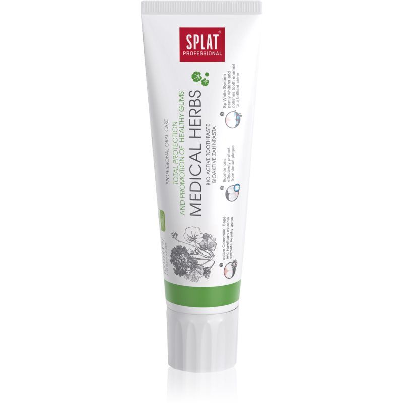 Splat Professional Medical Herbs, 100 gr, Complete bescherming Unisex, De tandpasta Splat Professional Medical Herbs biedt een complexe zorg voor je tanden en tandvlees. Reinigt tanden van tandplak en voedselresten en zorgt tegelijkertijd voor het tandvlees en de slijmvliezen van de mondholte. Kenmerken: reinigt op betrouwbare wijze de tanden zorgt voor het tandvlees vermindert de vorming van tandplak voorkomt het vastzetten van tandsteen versterkt tandglazuur verfrist de ademhaling Hoe te gebruiken: Poets je tanden minstens 2 keer per dag met een borstel van goede kwaliteit. Breng een gepaste hoeveelheid pasta op de tandenborstel aan en poets je tanden minstens 2 minuten. Spoel de mondholte grondig.