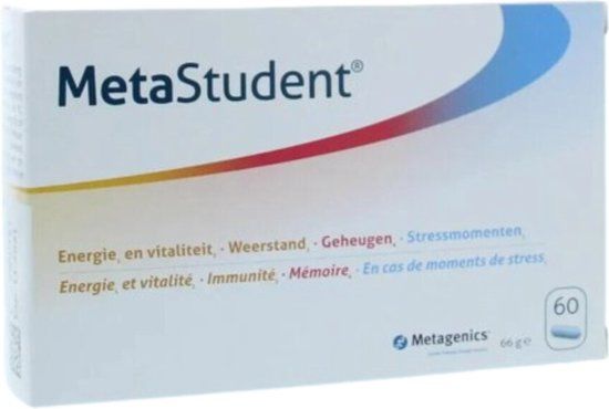 Metagenics MetaStudent Tabletten ondersteunt het normale energieniveau (vit B1, B2, B3, B5, B6, B12), en draagt bij tot een normale werking van het immuunsysteem (vitamine D, zink, vitamine C, selenium). Dit voedingssupplement draagt bij tot een normale cognitieve functie (jodium, zink) en tot een normaal leervermogen en geheugen (Panax ginseng-extract). Daarnaast bevat MetaStudent ook nutriënten te gebruiken bij stressmomenten (folaat) en vermoeidheid (folaat, magnesium, vit B6, B12, guarana-extract). MetaStudent is soja vrij, lactose vrij, gluten vrij en geschikt voor vegetariers.