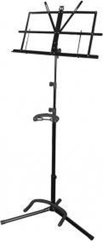 Handig ! een muziekstandaard en tegelijk een gitaarstandaard