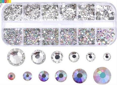 De Strass steentjes hebben verschillende diameters en hebben een ronde vorm.