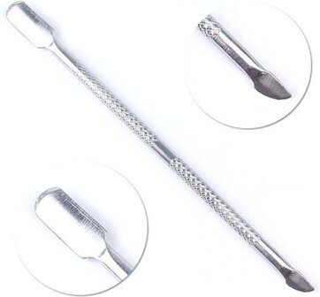 De metalen nagelriem remover wordt gebruikt voor nauwkeurig nagelriem trimmen en hybride polish verwijderen. Het heeft twee verschillende tips. De smallere, vlakkere tip verwijdert hybride lak van de nagelplaat, terwijl de andere ontworpen is om de nagelriemen naar binnen te duwen.