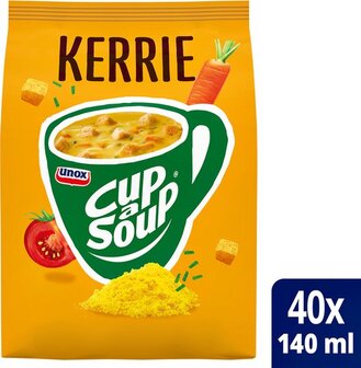 Heb je zin in een lekker soepje? Of heb je een drukke dag en zin in een snack om weer scherp en alert door te kunnen? Dan zit je bij Cup-a-Soup altijd goed! Zo ook met Cup-a-Soup Kerrie: een snelle, hartige opkikker die je weer energie geeft om door te gaan! Vol kruidige kerrie, maar ook met stukjes wortel, tomaat en knapperige croutons voor een nog vollere smaak. Een machinezak Cup-a-Soup Kerrie bevat 40 servings van 140 milliliter Cup-a-Soup. Een serving van deze heerlijke Cup-a-Soup Kerrie bevat 52 calorieën per mok.