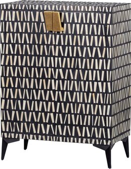 De Menne opbergkast, uit de Exclusive collectie van het Nederlandse interieurmerk WOOOD, is een ware blikvanger in huis en heeft bijzondere features. Zo is het frame van Menne gevormd uit matzwart mangohout en het onderstel van gepoedercoat metaal. Het unieke aan Menne is de buitenzijde met bone inlay, dit duurzaam ingewonnen materiaal is afkomstig vanuit slachtafval om zo dit unieke en opvallende interieurstuk te versieren!