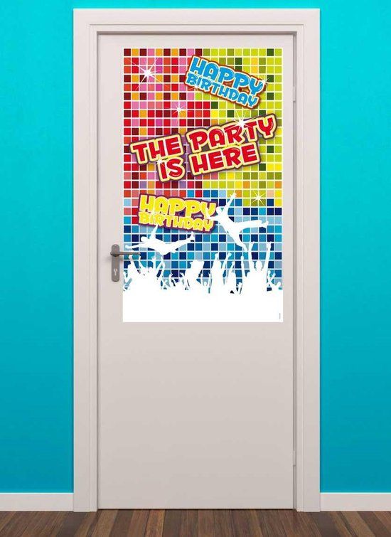 Waar is dat feestje? Daar is dat feestje!Met deze deurposter in kleurig mozaïek is het meteen duidelijk waar er feest wordt gevierd.