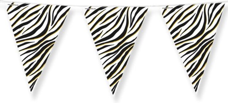Voeg een vleugje wildernis toe aan je feest met onze dubbelzijdige vlaggenlijn van 10 meter. Gemaakt van folie, deze vlaggenlijn biedt een opvallend zebra patroon in zwart-wit, verrijkt met subtiele gouden accenten. De contrasterende kleuren en het moderne ontwerp zorgen voor een stijlvolle en eigentijdse feestelijke sfeer.