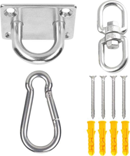 - 1x Ophangbeugel 1x karabijnhaak 1x 360 graden tussenstuk 4x schroeven 4x pluggen