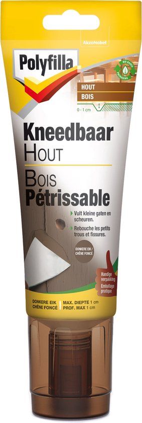Met Polyfilla Kneedbaar Hout kun je kleine scheuren en gaten vullen. Kneedbaar hout is geschikt voor alle soorten hout en is overschilderbaar met alle soorten verf voor hout (lak, beits of vernis). Beschikbaar in verschillende kleuren: Donkere eik, Lichte eik, Meranti, Naturel. De kleuren zijn onderling mengbaar zodat elk gewenste kleur te maken is. Maximale laagdikte: 1 cm. Schuur- en overschilderbaar na 3 uur (afhankelijk van laagdikte, temperatuur en luchtvochtigheid). Voor gebruik binnen en buiten.