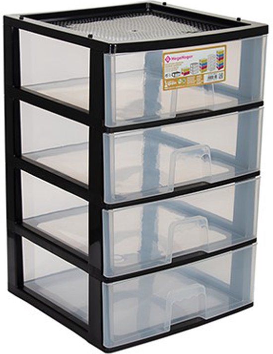 Ladeblokje/bureau organizer met 4x grote lades in de kleuren zwart/transparant. Een handig ladeblokje om uw artikelen in op te bergen met zwart frame en transparant lades met handvat. Ideaal voor op uw thuis kantoor/slaapkamer om uw spulletjes geordend te houden. Formaat ladeblokje: L38 x B38 x H58 cm. Materiaal: kunststof. Aantal lades/vakjes: 4x. Hoogte van de lades is ongeveer 14 cm. Opbergen/opruimen ladeblokken/ladekastjes voor kantoor/bureau.