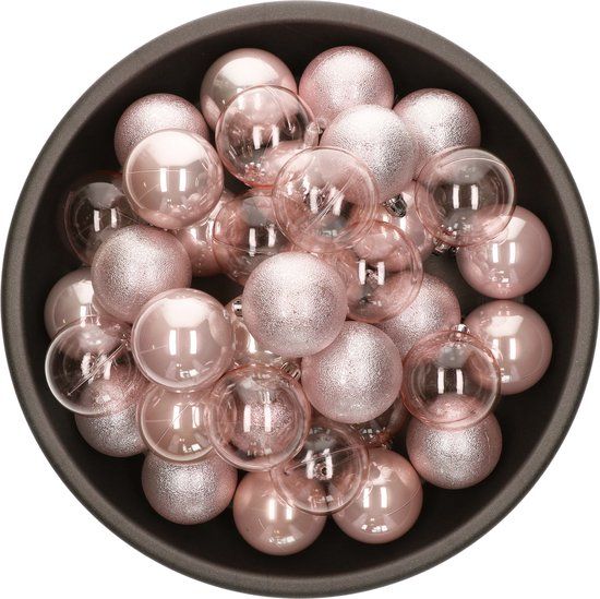 Mooie set met kunststof kerstballen. De set bestaat uit 25x stuks kerstballen van 6 cm doorsnee, vervaardigd uit kunststof in een prachtige lichtroze kleur. Mix van glans, transparant en glitter. De kerstballen zijn perfect om de kerstboom mee te versieren. De kerstballen hebben standaard lusjes, wij adviseren echter kerstbalhaakjes.