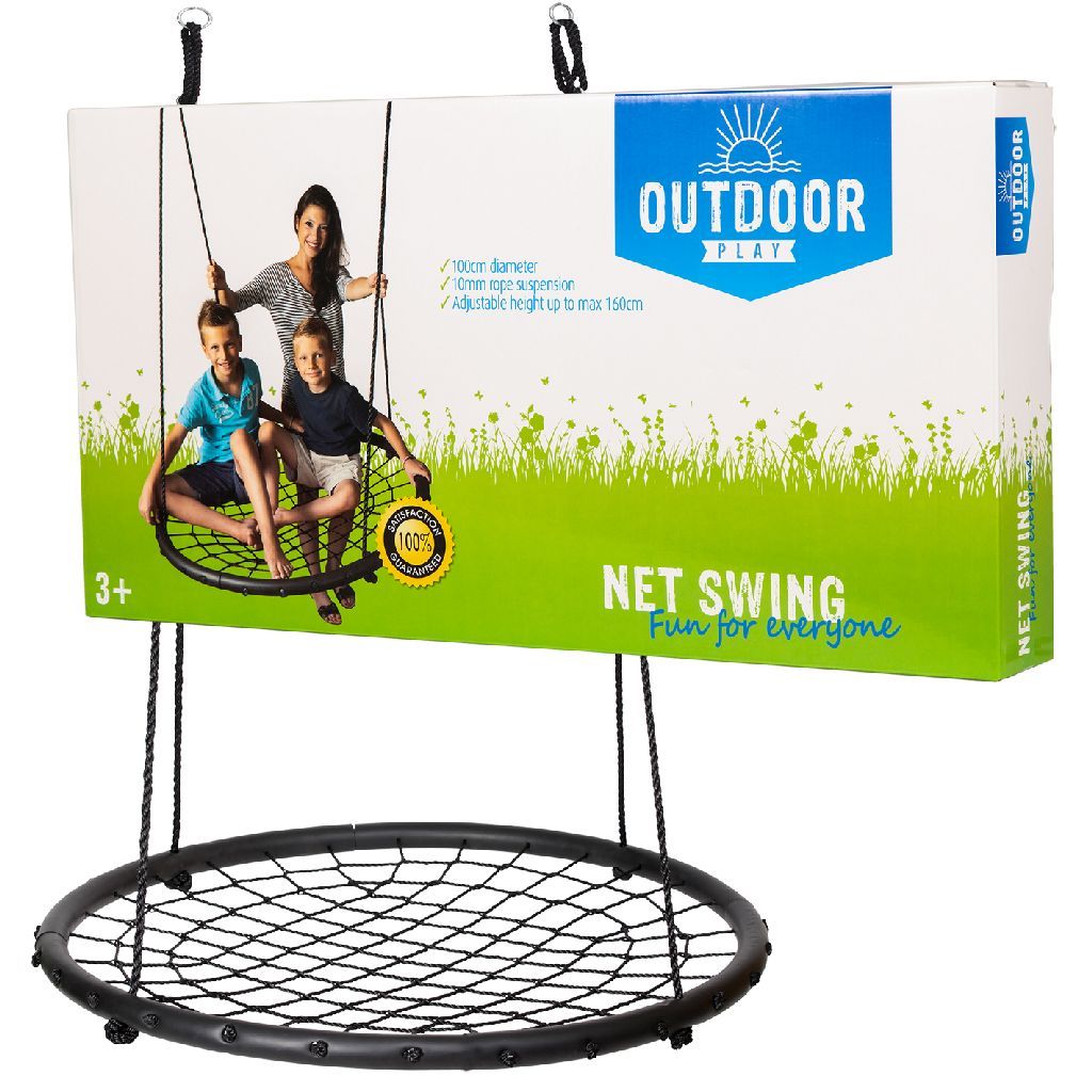 Outdoor Play Net Swing. Beleef een nieuwe schommelervaring met deze leuke zwarte net schommel. De diameter is 100 cm en het draagvermogen is 100 kg. Het touw is verstelbaar tot max. 160 cm en is 10 mm dik. Vervaardigd van 1,1 mm dik staal met een diameter van 25 mm, beschermd met een acrylrubberlaag. Wordt geleverd in full-colour doos met uitgebreide handleiding. Geschikt voor kinderen vanaf 3 jaar.