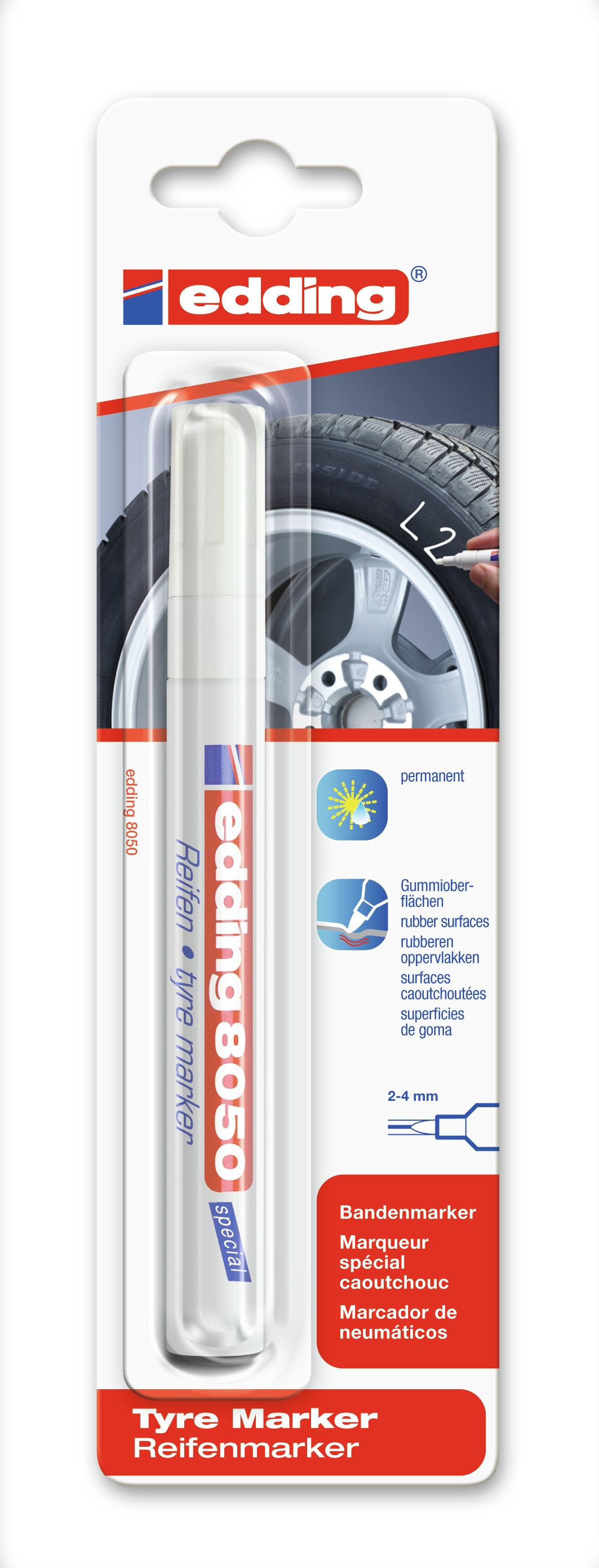Ieder jaar weer zomer- en winterbanden wisselen wordt gemakkelijker met de edding 8050 bandenmarker: deze bandenmarker is ideaal voor het aanbrengen van goed dekkende markeringen op uw banden. Zo weet u altijd welke band links of rechts, en voor of achter komt wanneer u ze uit de autobanden opslag haalt. Vroeger deed men dat met krijt, maar dat vervaagt op den duur. Dat kan met de edding 8050 bandenmarker niet meer gebeuren. De inkt houdt op zowel nieuwe als oude banden, en uiteraard ook op andere rubber onderdelen. Zo bent u goed voorbereid bij het autobanden vervangen. De bandenmarker is tevens uitermate geschikt voor het bijwerken van witte sierstrepen op banden of het natrekken van letters op motorbanden. De inkt van de edding 8050 bandenmarker is lichtbestendig, waterbestendig en veegbestendig. De schrijfbreedte van de ronde punt is ca. 2 - 4 mm. Voor het eerste gebruik de bandenmarker kort schudden, de punt op een stuk karton zetten en een paar keer indrukken totdat de inkt in de punt loopt en u kunt aan de slag.