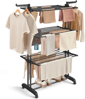 - DRIE NIVEAUS - Het heeft drie niveaus en zes onafhankelijke vleugels die individueel kunnen worden uitgeklapt. Dit maakt het mogelijk om de grootte van het droogrek aan te passen aan de hoeveelheid en lengte van de gewassen was. Aan beide zijden van het droogrek bevinden zich armen met zeven plekken voor hangers, wat resulteert in 14 extra plekken om wasgoed op te hangen. Het droogrek heeft ook een onderste plank, wat handig is voor het drogen van bijvoorbeeld schoenen. Met het droogrek volledig uitgevouwen, is het totale droogoppervlak maar liefst 24 meter en de maximale belasting is 25 kg.