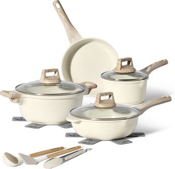 JUST PERFECTO HOUSEHOLD APPLIANCES JUST PERFECTO 12 Delige Pannenset Inductie - Beige Pannenset Met Deksel Voor Gas en Inductie - PFAS vrij - Koudgrepen - Pannendeksels