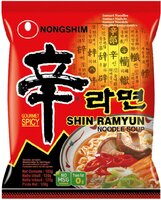 Shin Ramyun noedels van Nong Shim. Het Koreaanse bedrijf Nong Shim is gespecialiseerd in kant-en-klare noedels en snacks. Shin Ramyun is de nummer één in Korea. Deze smaak laat u flink zweten door haar scherpte. De combinatie van de peper kruidenmix met gedroogde groenten maakt van deze instant noedels een heerlijk kruidig gerecht. Deze noedels bevatten rundvlees aroma dat heel goed combineert met de pepermix. Voeg kokend water toe en geniet na 4-5 minuten van deze heerlijke pikante Nong Shim Instant Shin Ramyun Noedels.
