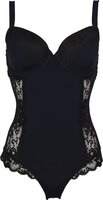 Voorgevormde demi cup bodystocking in recycled kant en micro. Elegant en vrouwelijk door de kanten details. Het beha gedeelte heeft een sluiting aan achterzijde, ook het kruisje is van een sluiting voorzien.