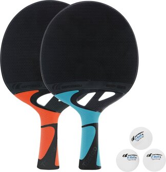 De Cornilleau Tacteo Pack Duo betstaat uit twee outdoor tacteo tafeltennisbats, 1 x lichtblauw en 1 x terracotta en drie tafeltennisballen. De Cornilleau Tacteo outdoor tafeltennisbats hebben met het nieuwe ontwerp een dynamische look gekregen die uitnodigt om lekker te gaan tafeltennissen. Door de perfecte samenwerking tussen technologische innovatie en design, zijn deze composiet Tacteo tafeltennisbats niet alleen weer-en schokbestendig maar hebben de bats ook een comfortabele grip. Het twin-injectie productieproces zorgt voor een perfecte hechting tussen het rubber en het blad waardoor het speeloppervlak niet los zal laten van de bat. Dankzij een elastomeer bovenlaag met SKIN+ technologie en de gepatenteerde oppervlakte structuur hebben de Cornilleau Tacteo tafeltennisbats een goede spin, speed en controle voor een meesterlijk spel.