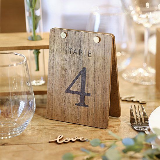 Houten tent tafelnummers 1-12 Voeg de rustieke sfeer van jullie huwelijksdag ook toe aan de tafeldecoratie. Deze houten tent tafelnummers 1-12 zullen een sjieke uitstraling geven op de dinertafels al dan niet gecombineerd met andere producten uit de rustic romance wedding serie. De tafelnummers (https://Bol.com/speciale-momenten/huwelijk/diner-en-feest/tafelnummers/) - welke als een soort tent (https://Bol.com/product/tipi-speeltent-jungle/) op tafel staan - zijn 13,6 cm hoog en 10 cm breed, op de borden staat Table 1, Table 2 etc. waardoor ze goed zichtbaar maar niet overheersend. Elk pakket bevat: * 12 x Houten tentkaarten met Tafels 1-12 * afmetingen van 13,6 cm (H) x 10 cm (B)