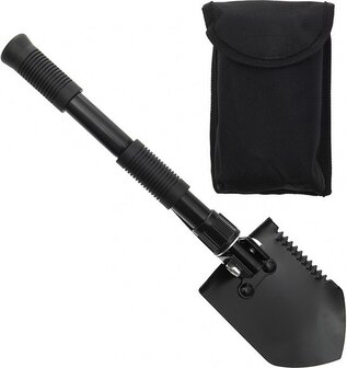 Kleine klapschep/vouwschep met houweel en hoes 41 x 13 cm. Zwarte mini klapschep met daaraan een houweel. Het blad is voorzien van een gekartelde rand zodat deze ook als zaag gebruikt kan worden. Wordt geleverd inclusief nylon hoes. De totale lengte van de schep is 41 cm, de lengte van het blad is 13 cm en de breedte 9,5 cm. Materiaal: metaal.