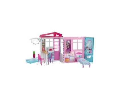 Open dit Barbie-poppenhuis en ga er meteen in - het draagbare huis ontvouwt zich en onthult een huis met één verdieping van meer dan 60 cm breed en 360 graden speelruimte!Er is een keuken, slaapkamer, badkamer en zwembad, elk met kenmerkende stijl en realistische achtergrondstickers, thema-accessoires en leuke functies.In de keuken helpen een gootsteen en kookplaat om kookverhalen na te spelen en een eilandbar is perfect om te dineren.De slaapkamer heeft een bed dat naar beneden kan worden geklapt en een kast waar kleding in kan.In de badkamer heeft een toilet een werkend deksel voor een realistisch tintje.Buiten kan het zwembad gevuld worden met water om een plons te maken terwijl er kleurrijke 'lichtjes' aan de patio hangen.Leuke stukken stimuleren de fantasie en het rollenspel, zoals kookgerei, couverts, een deken en een plant.Sommige stukken hebben handvatten die een pop kan vasthouden,en andere zijn ontworpen met een plug-and-play-systeem om op zijn plaats te blijven spelen en eenvoudig op te ruimen!Sluit om op te bergen of om mee te nemen.Jonge kinderen zullen het geweldig vinden om binnen of buiten verhalen te vertellen en van dit lieve poppenhuis een lief huis te maken, want als een meisje met Barbie speelt, beeldt ze zich alles in wat ze kan worden. Geschikt voor kinderen vanaf 3 jaar.