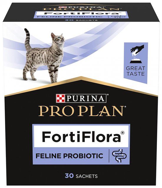 Purina Proplan FortiFlora Feline Probiotic 30 Sachets is een probiotisch supplement voor katten dat het immuunsysteem versterkt. Het kan gebruikt worden in verschillende situaties zoals: de stress van een nieuw huis, reizen, antibioticakuur, gebrek aan eetlust, losse ontlasting en winderigheid. Dit supplement minimaliseert maagdarmstoornissen die worden veroorzaakt door stress, abrupte veranderingen in het dieet of na een antibioticabehandeling.Het bevat een unieke bacteriestam die bijdraagt aan de goede werking en het evenwicht van de darm. Het is zeer smakelijk en gemakkelijk toe te dienen. De zeer smakelijke formule maakt het een uitstekende smakelijkheidsverbeteraar, vooral nuttig voor katten die lijden aan ziekte.