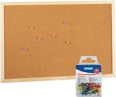 Prikbord van kurk met gekleurde punaises 60 x 40 cm. Kurken prikbord met houten omlijsting, ongeveer 2 x 60 x 40 cm groot. U ontvangt 1 prikbord en een doosje van 40 gekleurde punaises.