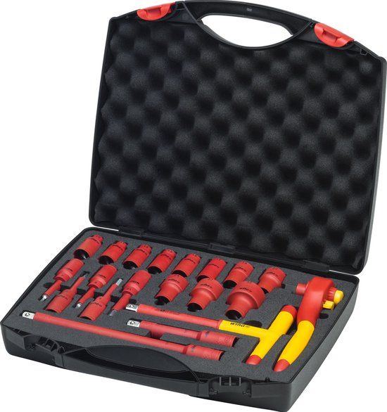 - 1x T-greepadapter geïsoleerd voor dopsleutels (43063), diameter vierkant: 1/2, totale lengte mm: 200, 1x ratelsleutel geïsoleerd voor dopsleutels (43053), diameter vierkant: 1/2, totale lengte mm: 250, 1x verlengstuk geïsoleerd (43056), diameter vierkant: 1/2, totale lengte mm: 250, 1x verlengstuk geïsoleerd (43055), diameter vierkant: 1/2, totale lengte mm: 125, 1x dopsleutelbit geïsoleerd (43077), buitenzeskant: 10, gewicht: 60, 1x dopsleutelbit geïsoleerd (43078), buitenzeskant: 11, gewicht: 60, 1x dopsleutelbit geïsoleerd (43079), buitenzeskant: 12, gewicht: 60, 1x dopsleutelbit geïsoleerd (43080), buitenzeskant: 13, gewicht: 60, 1x dopsleutelbit geïsoleerd (43081), buitenzeskant: 14, gewicht: 60, 1x dopsleutelbit geïsoleerd (43082), buitenzeskant: 17, gewicht: 70, 1x dopsleutelbit geïsoleerd (43083), buitenzeskant: 19, gewicht: 70, 1x dopsleutelbit geïsoleerd (43084), buitenzeskant: 22, gewicht: 90, 1x dopsleutelbit geïsoleerd (43085), buitenzeskant: 24, gewicht: 90, 1x dopsleutelbit geïsoleerd (43086), buitenzeskant: 27, gewicht: 130, 1x dopsleutelbit geïsoleerd (43087), buitenzeskant: 32, gewicht: 150, 1x dopsleutel geïsoleerd (43100), binnenzeskant: 4, totale lengte mm: 120, 1x dopsleutel geïsoleerd