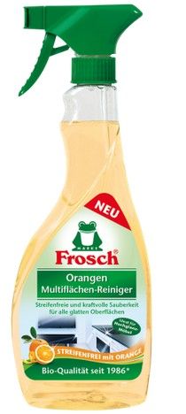 - For all smooth surfaces.\n- Streak-free with orange.\n- Ideal for high-gloss furniture and flat screens.\n\nFrosch Orange Multisurface-Cleaner is a naturally powerful surface cleaner for all smooth surfaces. The formula with natural orange extracts ensures streak-free cleaning and a brilliant shine on high-gloss and synthetic furniture, wood, metal, glass, car dashboards and flat screens.