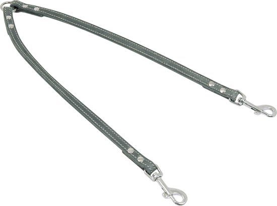 Handig en stijlvol 2 honden tegelijk uitlaten met deze dubbele Jack and Vanilla tussenlijn in de kleur Grijs met contrasterende stiksels. Deze dubbele tussenlijn is gefabriceerd uit soepel, zacht gevet leder van de topkwaliteit en is net afgewerkt. Deze tussenlijn is volledig gestikt en daarnaast geklonken voor extra duurzaamheid. De grote O-ring (aanlijnring) vergemakkelijkt het aan- en afkoppelen. Daarnaast is deze tussenlijn uitgevoerd met 2 stevige roterende karabijnhaken (sluitingen) in de kleur chroom. Deze tussenlijn met stijlvolle en tijdloze uitstraling is geschikt voor grote hondenrassen.