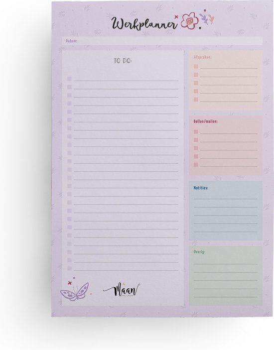 Op deze handige werkplanner schrijf je per dag of week (zelf te bepalen) al je 'to do's', taken en afspraken. Ook is er ruimte om andere dingen te noteren in de vakjes 'overig' en 'notities'. De indeling in vakken maakt het notitieblok handig in gebruik en overzichtelijk.