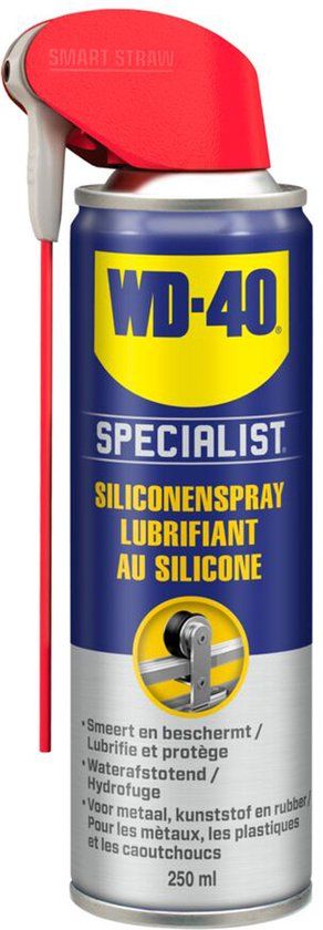 WD-40 Specialist Siliconenspray is een hoogwaardig siliconen smeermiddel dat zeer geschikt is voor gebruik op hogedruk apparatuur. Het verdringt vocht en zorgt voor een uitstekende smering, bescherming en verlenging van de levensduur van jouw gereedschap en apparatuur. Aangezien de spray op siliconenbasis is, is hij perfect voor gebruik op rubberen onderdelen zoals raamafdichtingen, slangen, buizen, leidingen en riemen. Je kunt het zelfs gebruiken op metaal, kunststof en hout, zonder dat het vlekken achterlaat. Het smeermiddel is kleurloos, plakt niet, en geeft een uitstekende bescherming tegen vocht. Naast het beschermen van gereedschap en machines tegen roest, stoot de Siliconenspray stof, vuil, olie en ander viezigheid af. Ook is het waterbestendig en blijft het werkzaam onder hoge druk. Met slechts een laagje kun je er zeker van zijn dat alles langer in goede conditie blijft en soepeler blijft functioneren. Het is geformuleerd om in verschillende (weers)omstandigheden werkzaam te blijven en kan gebruikt worden in temperaturen van -35°C tot en met +200°C. Met de Smart Straw- applicator heb je twee manieren om te spuiten; zowel breed als nauwkeurig. Klap het rietje omhoog om nauwkeurig te spuiten en klap het naar beneden om grotere oppervlakken te behandelen. Op welke manier je ook wilt spuiten, je kunt vertrouwen op het slimme 360° ventiel waardoor je zowel rechtop als ondersteboven kunt spuiten. PRODUCTEIGENSCHAPPEN Maakt waterdicht en beschermt tegen vocht Voorkomt roest en corrosie Voorkomt dat onderdelen kleven en binden Speciaal geformuleerd om de prestaties onder hoge druk te verbeteren Kleurloos en trekt geen vuil aan Bestand tegen temperaturen tot 200 ° C Compatibel met alle metalen, kunststoffen, rubbers en hout Smart Straw TOEPASSINGEN Beschermen van autoruit- en deurafdichtingen Beschermen van PVC raam- en deurgrendels PVC pijpen Geleiders voor garagedeuren Verbeteren van de werking van afsluiters, sloten en takels Verbetering van de werking van lagers, geleiderails en deurgeleiders Smeren van gereedschap