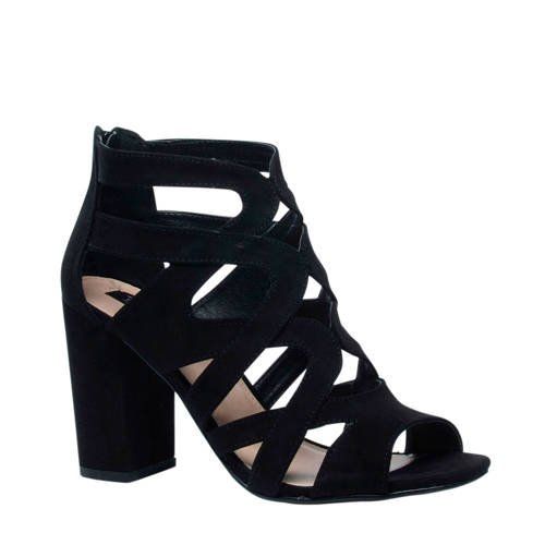 Dames sandalettes van Sacha, uitgevoerd in imitatiesuède met opengewerkt dessin. Het model is voorzien van een peep-toe, een ritssluiting op de hiel en een blokhak (9 cm.).