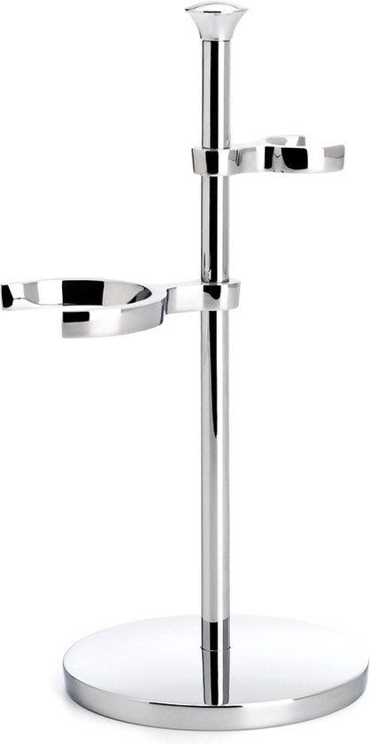 Elegante houder van verchroomd metaal voor je favoriete Muhle PURIST scheerkwast en scheermes. Een scheerkwast gaat langer mee als je deze omgekeerd ophangt in een scheerkwasthouder.