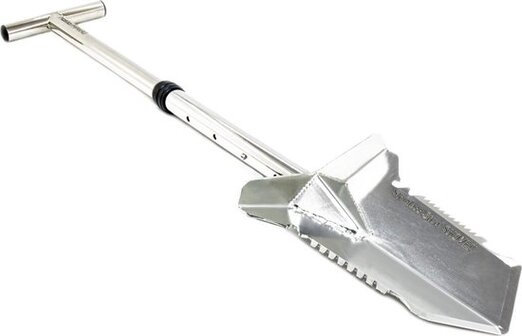 De robuuste Premium shovel van Nokta Makro is gemaakt van roestvrij staal en de steel is in 4 verschillende hoogtes verstelbaar. Door de 2 pinnetjes aan de zijkant in te drukken kunt u gemakkelijk de bovensteel uit de ondersteel trekken en zodoende compact transporteren. De bovensteel beschikt over een T-handvat en met een ingelasert Nokta Makro logo aan de voorkant van de bovensteel. Het blad van schep heeft aan beide kanten scherpe tanden waarmee u gemakkelijk door het gras of dunne boomwortels kunt spitten.