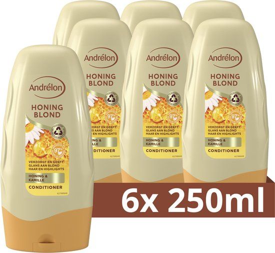 Andrélon Honing Blond Conditioner, verrijkt met kamille en honing, is speciaal ontwikkeld voor de verzorging van blond haar en highlights.