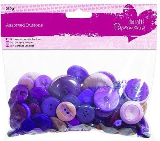 De populaire verpakking met gesorteerde knopen zijn terug. 250 gram paarse knopen in verschillende maten en vormen. De perfecte oplossing voor de drukke hobbyist.