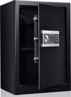 Het digitale codeslot van de kluis is batterij aangedreven waardoor je geen rekening hoeft te houden met het aansluiten op het lichtnetwerk. Als de batterijen op raken gaan het indicator lichtje rood branden. Daarnaast zijn er 2 sleutels aanwezig voor het geval de code wordt vergeten of de batterijen te weinig stroom levert. De kluis heeft een bescheiden simpele look, valt niet op en sluit aan op velen soorten interieur door de neutrale zwarte kleur.