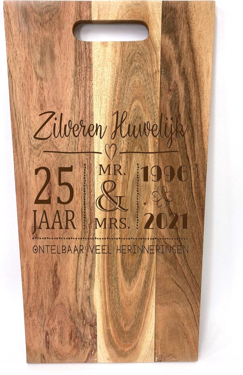 SandD-art Grote acacia snijplank - hapjesplank met tekst gravure ZILVEREN HUWELIJK - 25x50cm