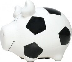 Spaarpot spaarvarken wit met voetbal print 12 cm. Wit spaarpotje in de vorm van een varkentje/biggetje met voetbal print. Materiaal: keramiek. Formaat: 12,5 x 9 x 9 cm. Dieren varkens/biggen spaarpotten cadeau/kado voor jongens/meisjes/kinderen en dames/heren/volwassenen.