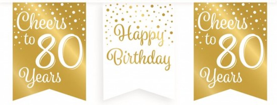 80 jaar geworden verjaardag thema party Vlaggenlijn in de kleuren goud en wit. Deze slinger is gemaakt van gerecycled karton. De vlaggetjes zijn 600 cm inclusief aanloopsnoer. Deze vlaggenlijn bestaat per stuk uit 5 witte vlaggen met de tekst Happy Birthday en 5 goudkleurige vlaggetjes met de tekst Cheers to 80 years erop.