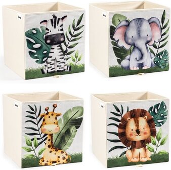 Ben je op zoek naar handige opbergoplossingen voor de kinderkamer? Ontdek dan onze set van 4 opbergmanden, perfect voor de Ikea Kallax kasten! Met een afmeting van 33x33x33 cm passen ze precies en kun je ze dankzij de geïntegreerde lussen gemakkelijk uit de kast halen. Met schattige junglediermotieven en gemaakt van stevig textiel met kartonnen versteviging, zijn ze ideaal voor het opruimen van speelgoed en kleding. Ontdek nu de ruimtebesparende en praktische manier om een opgeruimde kinderkamer te creëren!