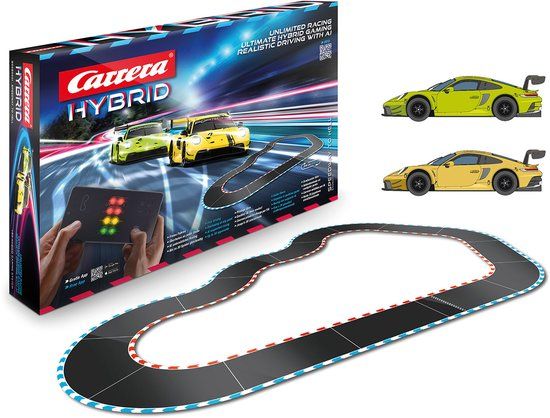 Beleef grenzeloze actie met de Carrera HYBRID Speedway to Hell racebaan! Met deze revolutionaire set til je je race-ervaring naar een geheel nieuw niveau. De twee Porsche 911 GT3 R-modellen, in de kleuren Speed Yellow en Acid Green, combineren krachtige prestaties met innovatieve AI-ondersteuning en hybridetechnologie. Jij bestuurt intuïtief via de speciale app en ervaart realistisch racen met virtuele tuning, bandenslijtage en individuele snelheidsinstellingen.