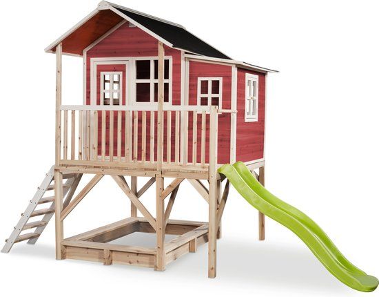 EXIT Loft 550 Houten Speelhuis - Rood - Met Glijbaan, Veranda & Zandbak