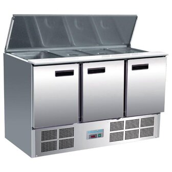 De Polar RVS Saladette met 3 deuren is een veelzijdig en praktisch keukenhulpmiddel, ontworpen om efficiëntie en organisatie in elke horecaomgeving te waarborgen. Dit model, met afmetingen van 85 x 137 x 70 cm, biedt voldoende ruimte voor het opbergen van diverse ingrediënten, met vier 11 GN bakken om uw verse producten veelzijdig en geordend te houden. De stevige roestvrijstalen constructie zorgt voor duurzaamheid en een gemakkelijke reiniging, ideaal voor drukke professionele keukens. De drie deuren zijn voorzien van handige handgrepen voor een snelle toegang, waardoor u moeiteloos kunt werken tijdens piekuren. Geïntroduceerd in 2017, heeft deze saladette zijn betrouwbaarheid en functionaliteit in de horeca-industrie bewezen. Kies voor de Polar RVS Saladette voor een praktische en robuuste oplossing die aan uw culinaire behoeften voldoet.Reviews