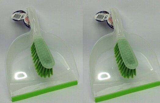 2x Stoffer en blik in de kleur wit met groen. Materiaal: kunststof. Afmeting: De stoffer heeft een lengte van ca. 32 cm en het blik heeft een afmeting van ca. 32 x 22 x 8 cm. Aantal stuks: 2.