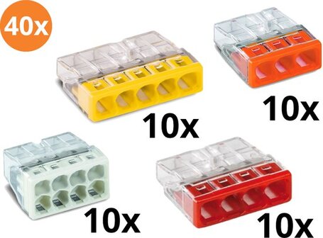 Wago lasklemmenset uit de serie 2273 voor massieve geleiders geleiders met een doorsnede van 0,5 t/m 2,5mm. Maximale nominale stroom voor de klem is 24A.